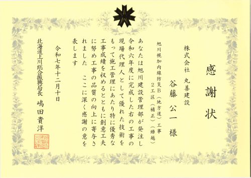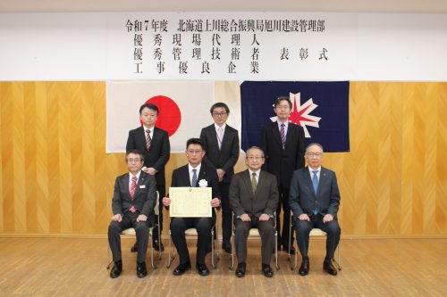 令和7年度 北海道上川総合振興局 旭川建設管理部 優秀現場代理人表彰を受賞いたしました。